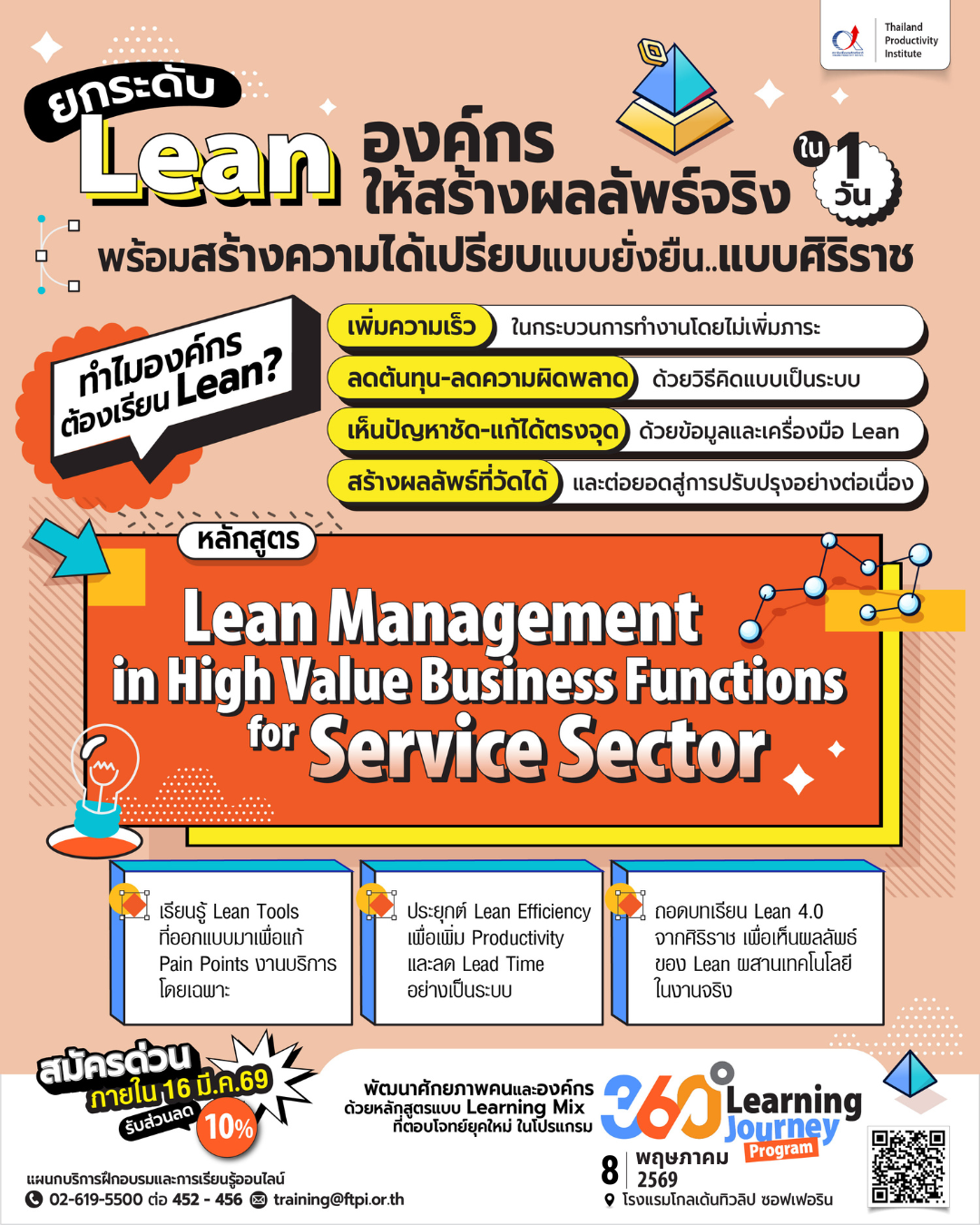 สอบถามข้อมูลเพิ่มเติม : แผนกบริการฝึกอบรมและการเรียนรู้ออนไลน์ สถาบันเพิ่มผลผลิตแห่งชาติ