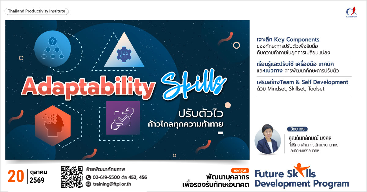 ในยุคดิจิทัลที่มีการเปลี่ยนแปลงอย่างรวดเร็วและต่อเนื่อง ทักษะด้าน Adaptability Skills หรือความสามารถในการปรับตัวจึงกลายเป็นทักษะที่จำเป็นอย่างยิ่งสำหรับการทำงานและการใช้ชีวิต หลักสูตรนี้ได้รวบรวมองค์ประกอบสำคัญที่จะช่วยพัฒนาความสามารถในการปรับตัวผ่านการเสริมสร้างทักษะที่จำเป็น ทั้งการฝึกมองสถานการณ์ด้วยมุมมองที่หลากหลายเพื่อค้นพบโอกาสใหม่ๆ การรู้เท่าทันและจัดการอารมณ์เพื่อรับมือกับความท้าทาย การเพิ่มความคล่องตัวในการเรียนรู้เพื่อก้าวทันโลกยุคดิจิทัล การพัฒนากระบวนการคิดแก้ปัญหาอย่างสร้างสรรค์ รวมถึงการปรับตัวให้ทำงานร่วมกับผู้อื่นได้อย่างราบรื่น ซึ่งทักษะเหล่านี้จะเป็นกุญแจสำคัญสู่ความสำเร็จในโลกยุคดิจิทัล