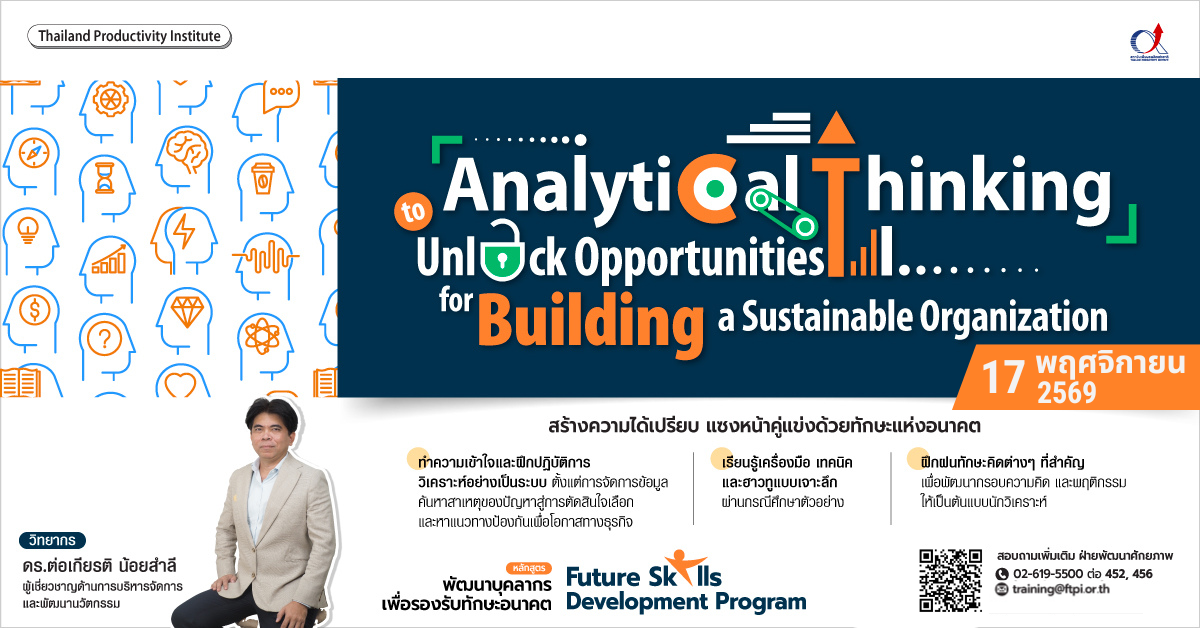 เหตุผล: การคิดเชิงวิเคราะห์ช่วยให้ผู้บริหารและทีม ทำงานเชิงรุกอย่างรวดเร็วและแม่นยำ ด้วยการวิเคราะห์แนวโน้มและผลกระทบในระยะยาวของปัจจัยทั้งภายนอกและภายในที่ส่งผลต่อการดำเนินงาน โดยออกแบบแนวทางปรับตัวและวางแผนเตรียมพร้อมป้องกัน และรับมือปัญหาในอนาคต รวมถึงส่งเสริมและขยายโอกาส ให้องค์กรเติบโตอย่างยั่งยืนท่ามกลางการเปลี่ยนแปลงที่เกิดขึ้นอยู่ตลอดเวลา