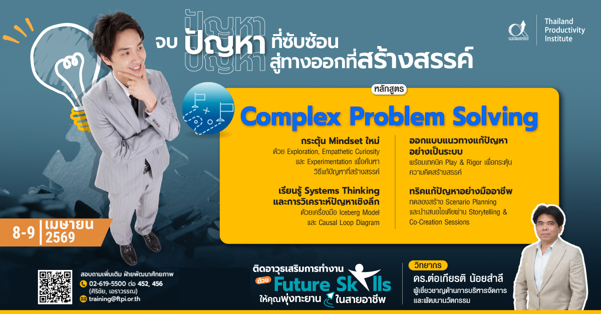 ดังนั้นการพัฒนาทักษะนี้ไม่เพียงแต่ช่วยให้คุณโดดเด่นในสายงาน แต่ยังเสริมสร้างความมั่นใจในการตัดสินใจ และเพิ่มโอกาสในการเติบโตในอาชีพ หลักสูตร “Complex Problem Solving” โดยสถาบันเพิ่มผลผลิตแห่งชาติออกแบบมาเพื่อเสริมสร้างความสามารถเหล่านี้ ผ่านการเรียนรู้ที่เน้นปฏิบัติจริง และกรณีศึกษาที่ทันสมัย ซึ่งอธิบายถึงแนวทางการวิเคราะห์ปัญหาซับซ้อนในการ ดำเนินงาน สามารถค้นหาจุดสร้างความซับซ้อนในกระบวนการ และระบบธุรกิจ นาไปสู่การออกแบบแนวทางจัดการปัญหาซับซ้อน ให้เกิดคุณค่ากับธุรกิจ