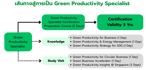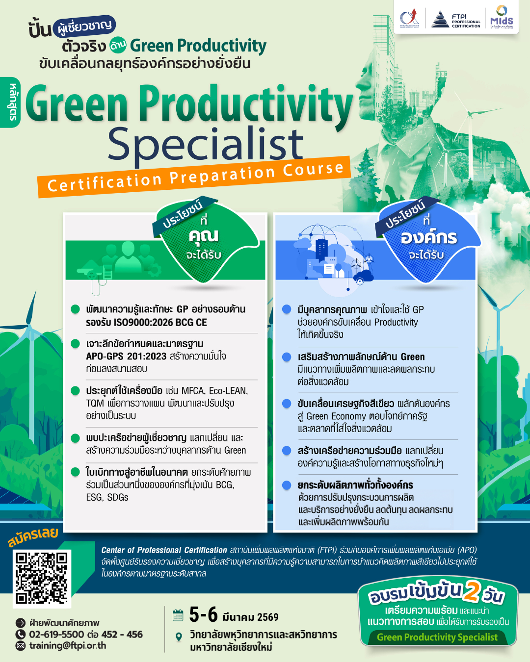 - พัฒนาบุคลากรให้มี องค์ความรู้ + ทักษะ ด้าน Green Productivity ตามมาตรฐานสากล (APO-GPS 201:2023)